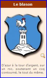 D'azur à la tour posée sur un rocher mouvant de la pointe et sommée d'un coq contourné, le tout d'argent.