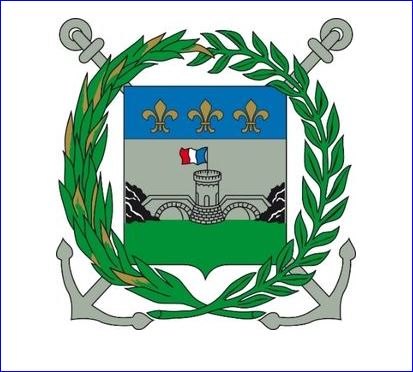 D'argent à la tour au trait de sable accostée de deux ponts d'une seule arche de même la reliant à deux rochers de sable mouvant des flancs, la tour sommée du drapeau tricolore de la France au naturel flottant vers la dextre; le tout posé sur une champagne de sinople; au chef d'azur chargé de trois fleurs de lis d'or.