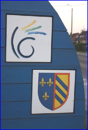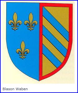 Parti: au 1er d'azur à trois fleurs de lis d'or, au 2e d'or à trois bandes d'azur et à la bordure de gueules.