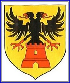 (1984) D'or la tour de gueules, ouverte et ajourée du champ, sommée d'une aigle bicéphale de sable, becquée et membrée de gueules.