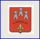 De gueules à trois tours d'argent mal ordonnées, accompagnées d'une fleur de lis d'or en pointe elle-même surmontée de l'inscription «CASTELET» en lettres capitales de sable ordonnées en arc de cercle.