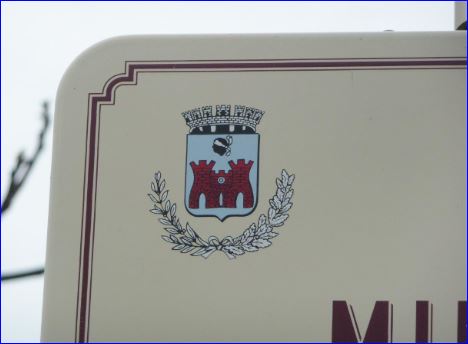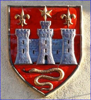 De gueules au château de trois tours d'argent, (crénelé d'or,) ouvert, ajouré et maçonné de sable, la tour du milieu donjonnée (d'or) et surmontée d'une étoile de six rais d'or, les tours des flancs surmontées chacune d'une fleur de lis d'or, ledit château soutenu d'un serpent du même ondoyant en pal.