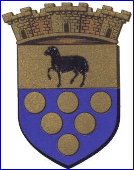 (1968) D'azur à six besants d'or ordonnés 3, 2 et 1; au chef d'or chargé d'un agneau passant de sable.