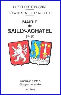 (2) Parti: au 1er mi-parti d'azur à deux bars adossés d'or accompagnés de quatre croisettes recroisetées au pied fiché du même, au 2e de gueules au dextrochère de carnation, vêtu d'azur, mouvant d'une nuée d'argent, tenant une épée du même garnie d'or et accostée de deux cailloux d'or; au mur crénelé d'argent, maçonné de sable, mouvant de la pointe et brochant sur le tout. (ACHATEL)