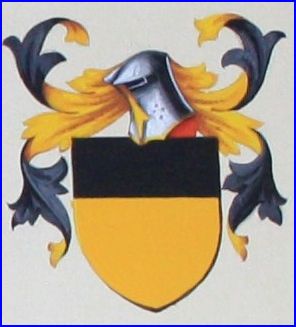 D'or au sauvage de gueules appuyé à senestre sur une massue de sable, le bras droit tendu et portant sur sa dextre un coq de sable; au chef du même; le tout sommé d'un chef de gueules semé d'étoiles d'argent.
