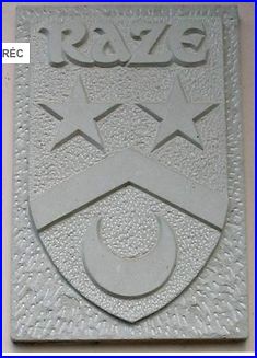 Divisé en chevron: au 1er d'azur à deux étoiles d'or, au 2e de gueules au croissant d'argent, au chevron d'or brochant sur la partition.