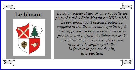 (1993) Écartelé: au 1er de gueules à deux bâtons de prieur d'or, passés en sautoir et mouvant des angles de la pointe, au 2e d'argent au sapin au naturel, au 3e d'argent à la pomme de pin au naturel, au 4e de gueules au berrichon [petit oiseau troglodyte] d'or.