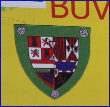 Écartelé: au 1er contre écartelé aux I et IV de gueules à la tour [château] d'or maçonnée de sable, aux II et III d'argent au lion de pourpre couronné d'or, au 2e parti au I d'or à quatre pals de gueules, au II écartelé en sautoir aux I et IV d'or à quatre pals de gueules, aux II et III d'argent à l'aigle de sable, becquée et membrée de gueules, les 1er et 2e quartiers, entés en pointe d'argent à la grenade d'or, ouverte de gueules, tigée et feuillée de sinople, au 3e coupé au I tiercé en fasce de gueules, d'argent et de sinople, au II bandé d'or et d'azur et à la bordure de gueules, au 4e coupé au I d'azur semé de fleurs de lis d'or et à la bordure componée d'argent et de gueules, au II de sable au lion d'or, armé et lampassé de gueules; à l'écusson d'argent à (cinq ?? de sable ordonnés en croix) et à la bordure de gueules (chargée de huit ?? d'or) brochant sur les 1er et 2e quartiers de l'écartelé; à l'écusson parti au I d'or au lion de sable armé et lampassé de gueules, au II d'argent à l'aigle de gueules, becquée et membrée d'or, les ailes chargées d'un kleestengel du même, brochant sur les 3er et 4e quartiers de l'écartelé; le tout enfermé dans une bordure de sinople chargée de trois roses d'argent.