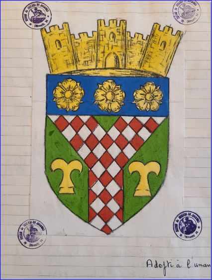 (1965) De sinople au pairle losangé d'argent et de gueules, accosté de deux rocs d'échiquier d'or; au chef cousu d'azur chargé de trois roses d'or.
