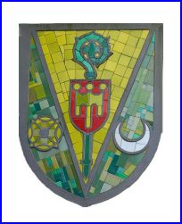 D'or à la crosse contournée de sinople, à l'écu de gueules chargé d'un gonfanon d'or, frangé de sinople, brochant en abîme; chaussé de sinople, chargé à dextre d'une rose d'or et à senestre d'un croissant d'argent.
