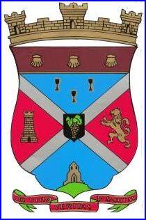 Écartelé en sautoir: au 1er d'azur à trois verres à pied cousus de sable, au 2e de gueules à la tour d'or ouverte et maçonnée de sable, au 3e de gueules au lion à la queue léopardée d'or, au 4e d'azur au portail d'église d'or, ouvert et ajouré de sable, posé sur un tertre de sinople; au sautoir diminué d'argent brochant sur la partition; sur le tout, de sable à la grappe de raisin d'or feuillée de deux pièces de sinople; le tout sommé d'un chef de pourpre, soutenu d'un filet d'or et chargé de trois coquilles du même.