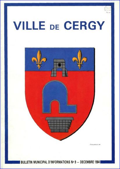 De gueules à la boucle de l'Oise stylisée d'azur, bordée d'argent soutenue par le bâtiment de la Préfecture du même; au chef cousu d'azur chargé en flancs de deux fleurs de lis d'or, au porche d'argent brochant sur le trait du chef.