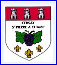 D'argent à la grappe de raisin d'azur feuillée de deux pièces de sinople et soutenue de trois fleurs de lis d'or, ordonnées 2 et 1 et surmontées des inscriptions de sable «CERSAY» et «ST PIERRE A CHAMP», l'une au-dessus de l'autre; au chef de gueules chargé de trois tours d'argent ouvertes et maçonnées de sable.
