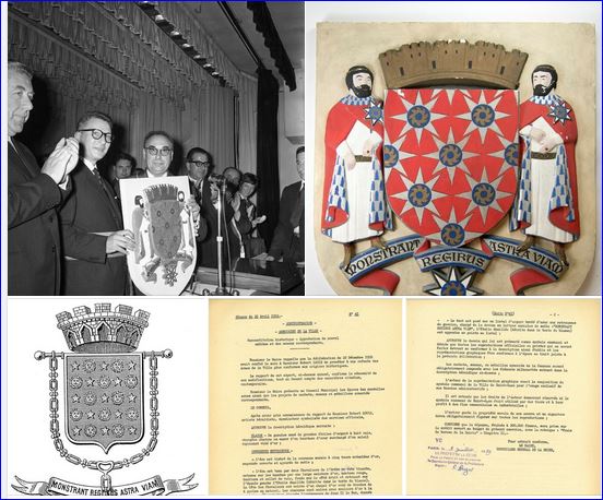 (1959) De gueules semé de grandes étoiles d'argent à huit rais, chargées chacune en coeur d'un tourteau d'azur surchargé d'un soleil d'or éclipsé d'azur.