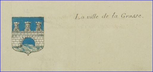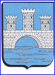 D'azur au pont d'une seule arche d'argent, sommé de trois tours du même, le tout maçonné de sable et posé sur des ondes du champ agitées d'argent mouvant de la pointe.