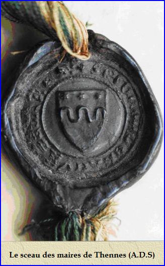 écu à la fasce ondée, accompagnée de trois étoiles en chef. On ignore les couleurs de ce blason; le sceau est conservé aujourd'hui avec le parchemin aux Archives de la Somme, en provenance de l'abbaye de Corbie. Avec une restitution de couleurs (les couleurs originales ne sont pas connues), le blason des maïeurs de Thennes aurait pu inspirer un autre blason pour la commune de Thennes.