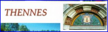 Quand la mairie-école fut reconstruite, après les destructions de la première guerre mondiale, les architectes conçurent d'orner le fronton de l'entrée principale d'un écu moderne en accolade. Comme ce fronton était réalisé en carrés de faïence, les décorateurs choisirent, faute de blason municipal, d'utiliser de tels carreaux pour inscrire à l'intérieur de l'écu, sur fond blanc, deux lettres superposées. Aussi, aujourd'hui, la commune de Thennes ne connaît pas d'autres armoiries que celles-ci. Le village de Thennes, qui appartenait depuis le VIIIe siècle pour sa plus grande partie à l'abbaye de Corbie qui la conserva jusqu'à la Révolution, bénéficia pourtant d'un statut communal, et les premiers maïeurs furent porteurs du nom. Ainsi, Eustache de Thennes est maïeur en 1222. En 1294, Pierre de Thennes (Pieron le maeur de Tanes), écuyer et maïeur de Thennes, échange avec l'abbaye de Corbie