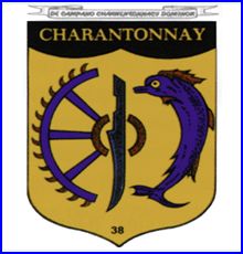 D'or à la demie roue de sainte Catherine d'azur, les pointes et le moyeu de gueules, faillie à senestre, senestrée d'un dauphin d'azur, barbé, crêté, oreillé lorré et peautré de gueules; au coutre [fer de charrue] de sable posé en pal et brochant en coeur sur la roue; au comble de sable nuagé de deux pièces et chargé de l'inscription « CHARANTONNAY » en lettres d'or.