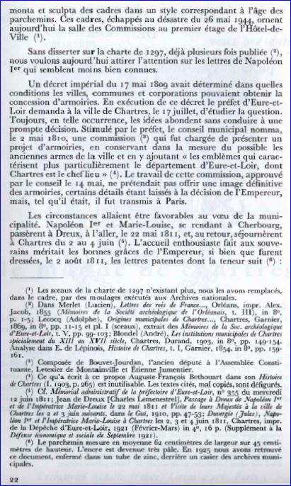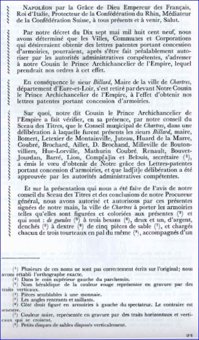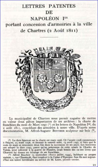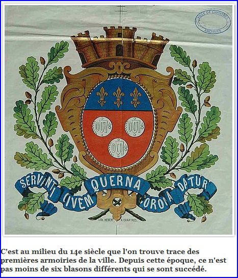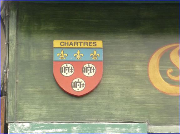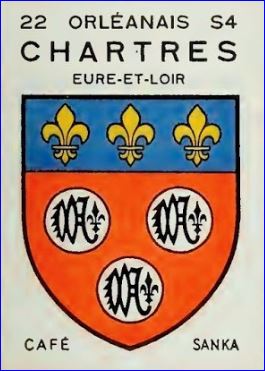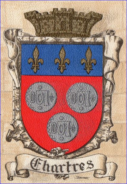 De gueules à trois besants d'argent, chargé chacun d'une inscription de sable frappé au droit d'un denier du Moyen âge du type bléso-chartrain; au chef d'azur chargé de trois fleurs de lis d'or.