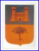 (1942) Coupé: au 1er d'azur au château d'argent ouvert ajouré et maçonné de sable, au 2e d'or au chêne arraché de sinople.