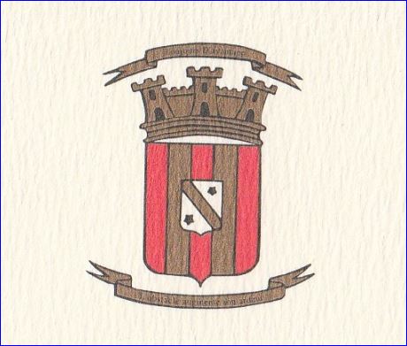 (1981) De gueules à deux pals d'or, à l'écusson en abîme d'argent chargé d'une bande de sable remplie d'or, accompagnée de deux étoiles (roses) de gueules.