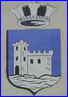 D'azur au château flanqué à dextre d'une grosse tour carrée en demi-profil, le tout d'argent, maçonné et ajouré de sable, la tour ouverte du même, sur une terrasse d'argent.
