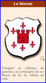 D'argent au château de gueules, accompagné de six fleurs de lis du même ordonnées en orle, 1, 2, 2 et 1.