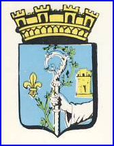 (1961) D'azur au dextrochère de carnation vêtu d'une manche monacale au naturel, tenant une crosse d'or entortillée d'une branche de lierre d'argent, adextrée d'une fleur de lis d'or et senestrée d'un château de deux tours donjonné du même.