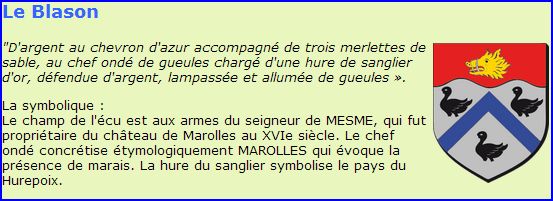 (1985) D'argent au chevron d'azur accompagné de trois merlettes de sable; au chef ondé de gueules chargé d'une hure de sanglier d'or défendue d'argent, languée et allumée de gueules.