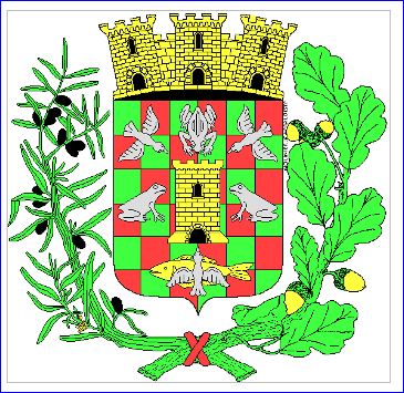 Échiqueté de sinople et de gueules à la tour d'or ouverte, ajourée et maçonnée de sable brochant, surmontée d'une grenouille descendante accostée de deux colombes fondantes, celle de dextre en bande et celle de senestre en barre, accostée de deux grenouilles assises affrontées, le tout d'argent et soutenue d'une troisième colombe montante du même brochant sur une truite d'or.