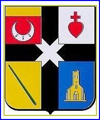 (1989) Écartelé: au 1er de gueules au croissant d'argent chargé de trois mouchetures d'hermine de sable et au chef d'or; au 2e d'argent au coeur croiseté de gueules, au 3e d'or à la perche [bâton alésé] de sinople posée en bande, au 4e d'azur à l'église au clocher masuré d'or; à la croix réduite de sable chargée en abîme d'un sautoir d'argent.