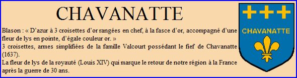 D'azur à la fleur de lis d'or en pointe, accompagnée de trois croisettes du même rangées en chef soutenues par l'inscription « CHAVANATTE » en lettres capitales d'or.