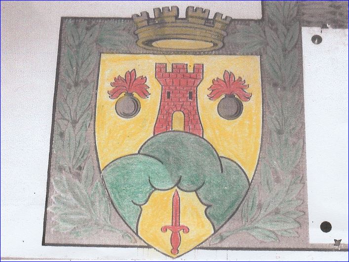 D'or à la tour de gueules accostée de deux grenades de sable, enflammées de gueules, posée sur une montagne de sinople ouverte du champ, l'ouverture chargée d'une crosse contournée de sable mouvant de la pointe.