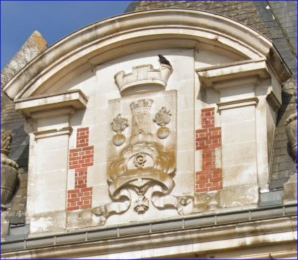 Blason sculpté sur la façade de la mairie, Google Street, 2023.