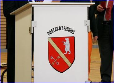 De gueules à la cotice d'or accompagnée, en chef, d'un ours en pied d'argent et, en pointe, de deux clés passées en sautoir, celle en bande d'argent et celle en barre d'or.
