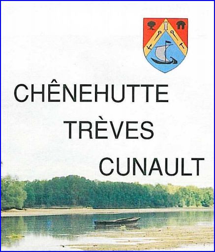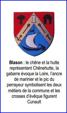 Divisé en chevron: au 1er de gueules au chêne de sable à dextre et à la hutte du même à senestre, au 2e d'azur à la gabare de sable, habillée d'argent; au chevron haussé d'or, chargé en chef d'une tour d'argent, soutenue de deux crosses affrontées, elles-mêmes soutenues à dextre d'une ancre de marinier et à senestre d'un pic de perreyeur, le tout de sable et posé dans le sens du chevron, celui-ci brochant sur la partition.