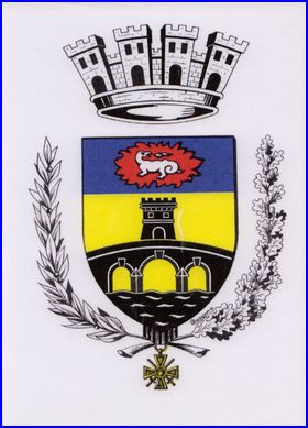 D'or au pont de trois arches sommé d'une tour, le tout de sable, posé sur une rivière du même agitée d'argent, mouvant de la pointe; au chef d'azur chargé d'une salamandre d'argent dans sa patience de gueules.