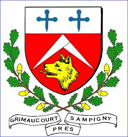 (2011) De gueules à deux piles d'argent croisées en chevron et soutenues par une tête de loup arrachée d'or; au chef d'argent chargé de deux croisettes pommetées aux pieds fichés d'azur.