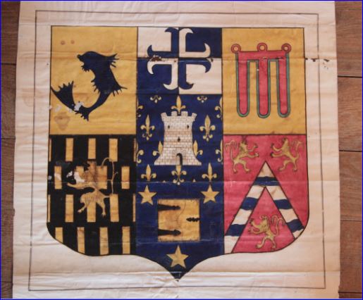 Parti de deux, coupé de un soit six quartiers: au 1er d'or au dauphin d'azur, allumé et lorré de gueules, au 2e écartelé d'argent et d'azur à la croix ancrée brochant de l'un en l'autre, au 3e d'or au gonfanon de gueules frangé de sinople, au 4e de sable semé de billettes d'or au lion de même brochant, armé et lampassé de gueules, au 5e d'azur à l'huis d'or verrouillé de sable, accompagné de trois étoiles d'or, au 6e de gueules au chevron fascé ondé d'argent et d'azur accompagné de trois lionceaux d'or, ceux du chef affrontés; sur le tout, d'azur semé de fleurs de lis d'or à la tour du même, maçonnée et ouverte de sable, brochante.
