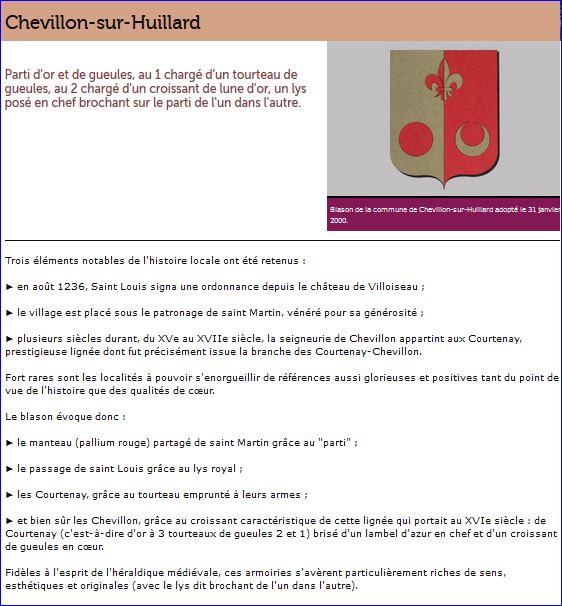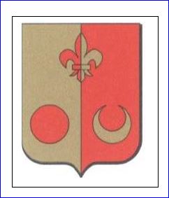 (2000) Parti d'or et de gueules, à la fleur de lis brochant sur la partition en chef et soutenue, à dextre, d'un tourteau et, à senestre, d'un croissant, le tout de l'un en l'autre.