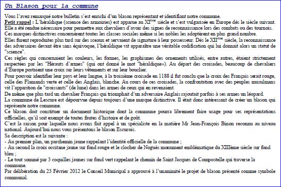(2012) Parti: au 1er d'azur à l'église du lieu d'or maçonnée, ouverte et ajourée de sable mouvant du flanc senestre, au 2e de gueules à la croix cléchée, vidée et pommetée de douze pièces d'or; le tout sommé d'un chef de sinople chargé de trois coquilles d'or.