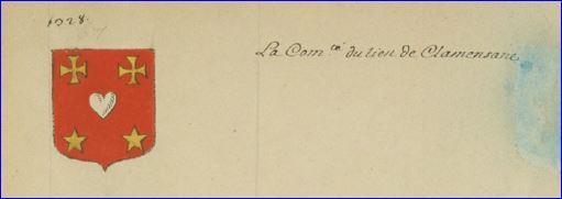 De gueules au cœur d'argent en abîme, accompagné de deux croisettes pattées d'or, rangées en chef et de deux étoiles du même rangées en pointe.