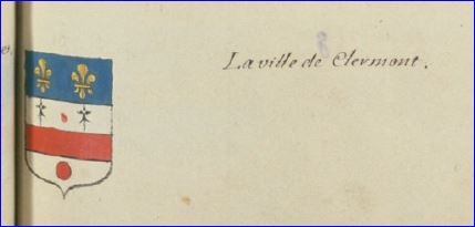 (1697) D'argent à la fasce de gueules, accompagnée en chef de deux mouchetures d'hermine de sable et en pointe d'un tourteau de gueules; au chef d'azur chargé de deux fleurs de lis d'or.