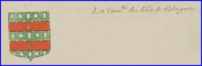 Parti: au 1er de sinople grillagé en filet d'or, au 2e de gueules à onze besants d'or rangés en trois pals de 5, 4 et 2 pièces; au chef d'azur chargé de trois fleurs de lis d'or soutenues (d'une divise de gueules chargée) d'une épée d'argent, garnie d'or et posée en fasce.