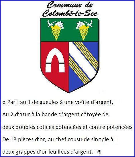 Parti: au 1er de gueules à la voûte ogivale d'argent, au 2e d'azur à la bande d'argent côtoyée de deux jumelles potencées imbriquées intérieurement d'or; le tout sommé d'un chef de sinople chargé de deux grappes de raisins d'or tigées et feuillées d'argent.