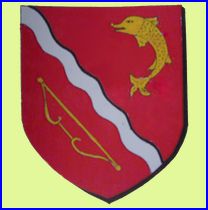 De gueules à la cotice ondée d'argent, accompagnée en chef d'un dauphin d'or et en pointe d'un arc du même versé et posé en bande.