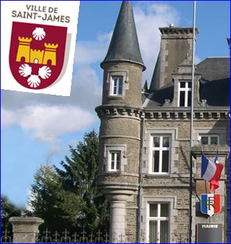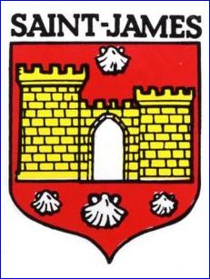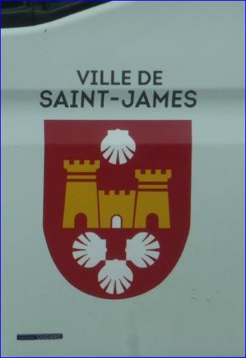 De gueules à la porte de ville flanquée de deux tours crénelées d'or, celle de dextre plus élevée que l'autre, ouverte d'argent et accompagnée de quatre coquilles du même, une en chef et trois en pointe, ordonnées 2 et 1, les deux supérieures couchées et affrontées.