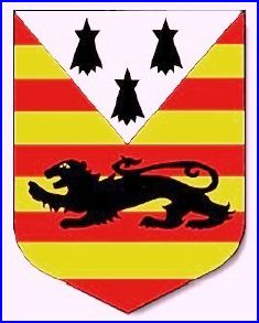 D'argent a trois mouchetures d'hermine de sable; au mantel renversé de gueules chargé de quatre fasces d'or et d'un lion léopardé morné de sable brochant en pointe.