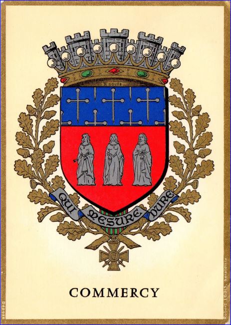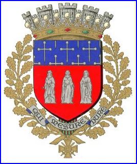 (1957) De gueules à trois demoiselles d'argent rangées en fasce; au chef cousu d'azur semé de croisettes pommetées au pied fiché d'argent.