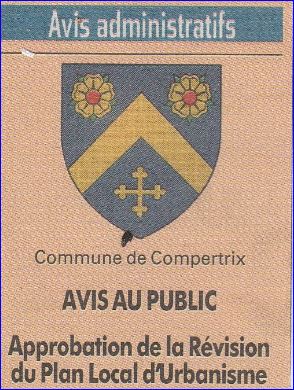 (2002) D'azur au chevron d'or accompagné en chef de deux roses du même, boutonnées de gueules et pointées de sinople et en pointe d'une croisette tréflée d'or.